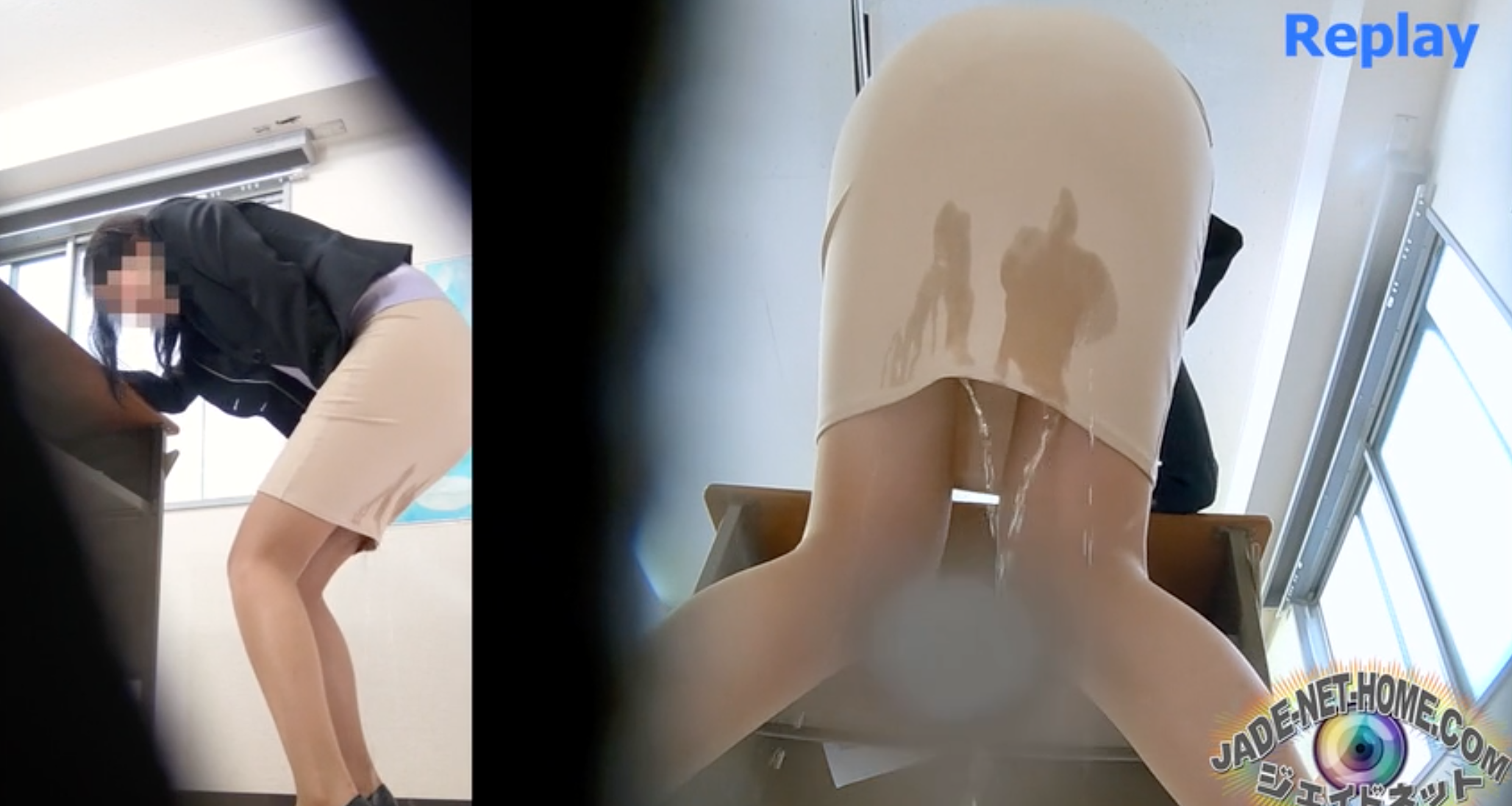プシュッ……ジョロロロ……!タイトスカートのお尻の部分が一瞬で濃い色に染まり、