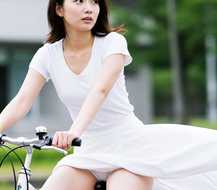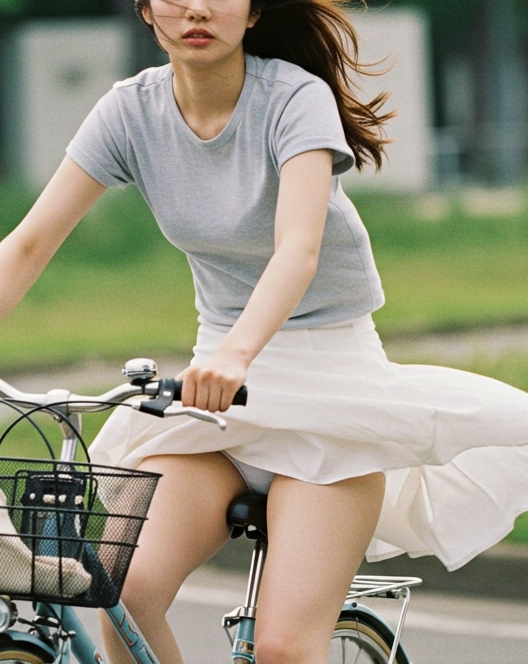 自転車のスピードが出ると、さらに向かい風にめくれてしまいそうなスカート。