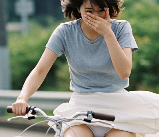 ミニスカートで自転車に乗ったら強い向かい風でスカートがめくれて・・・