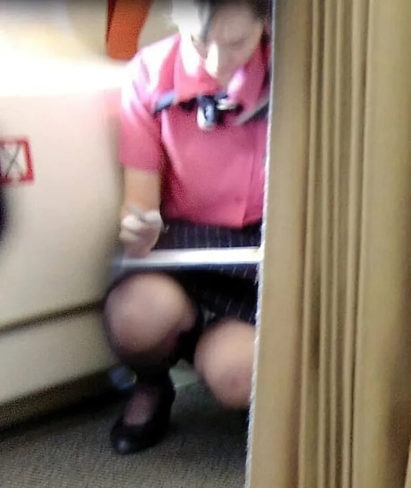 美人スチュワーデスがしゃがんだ瞬間を見のがざず、ローアングルからパンチラ盗撮!